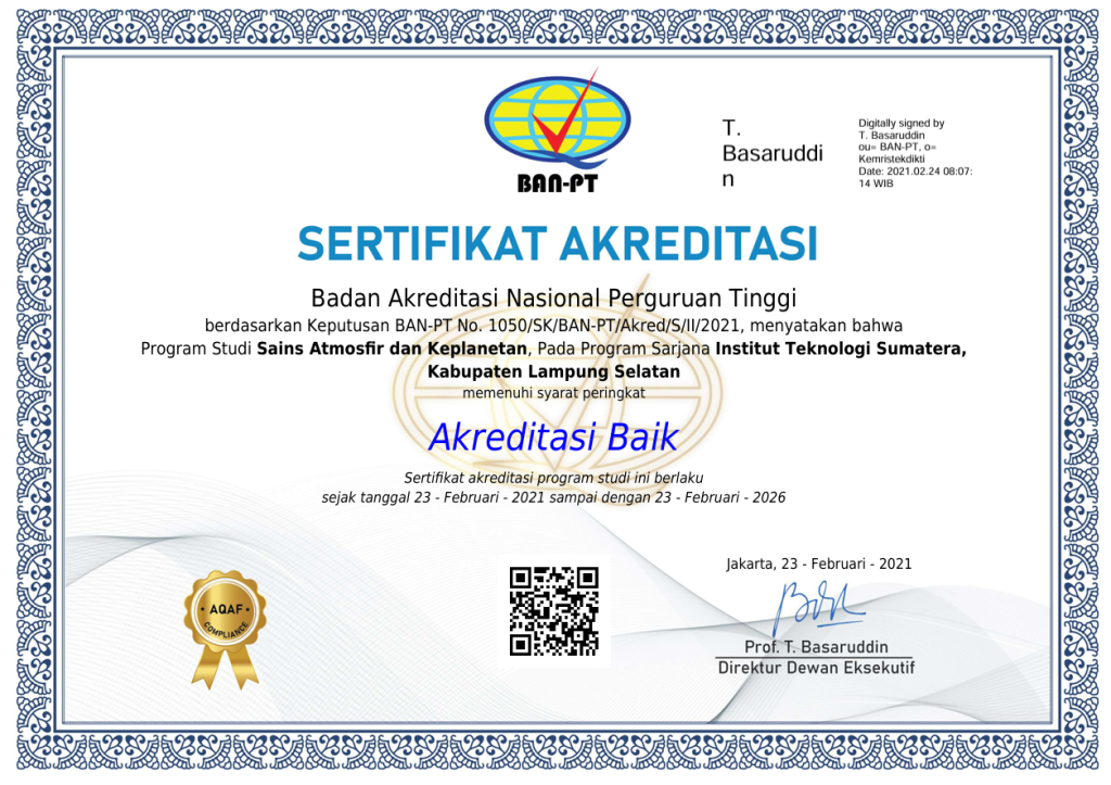 Program Studi Sains Atmosfer dan Keplanetan terakreditasi untuk pertama kali oleh BAN-PT pada tahun 2021 dengan predikat Baik.